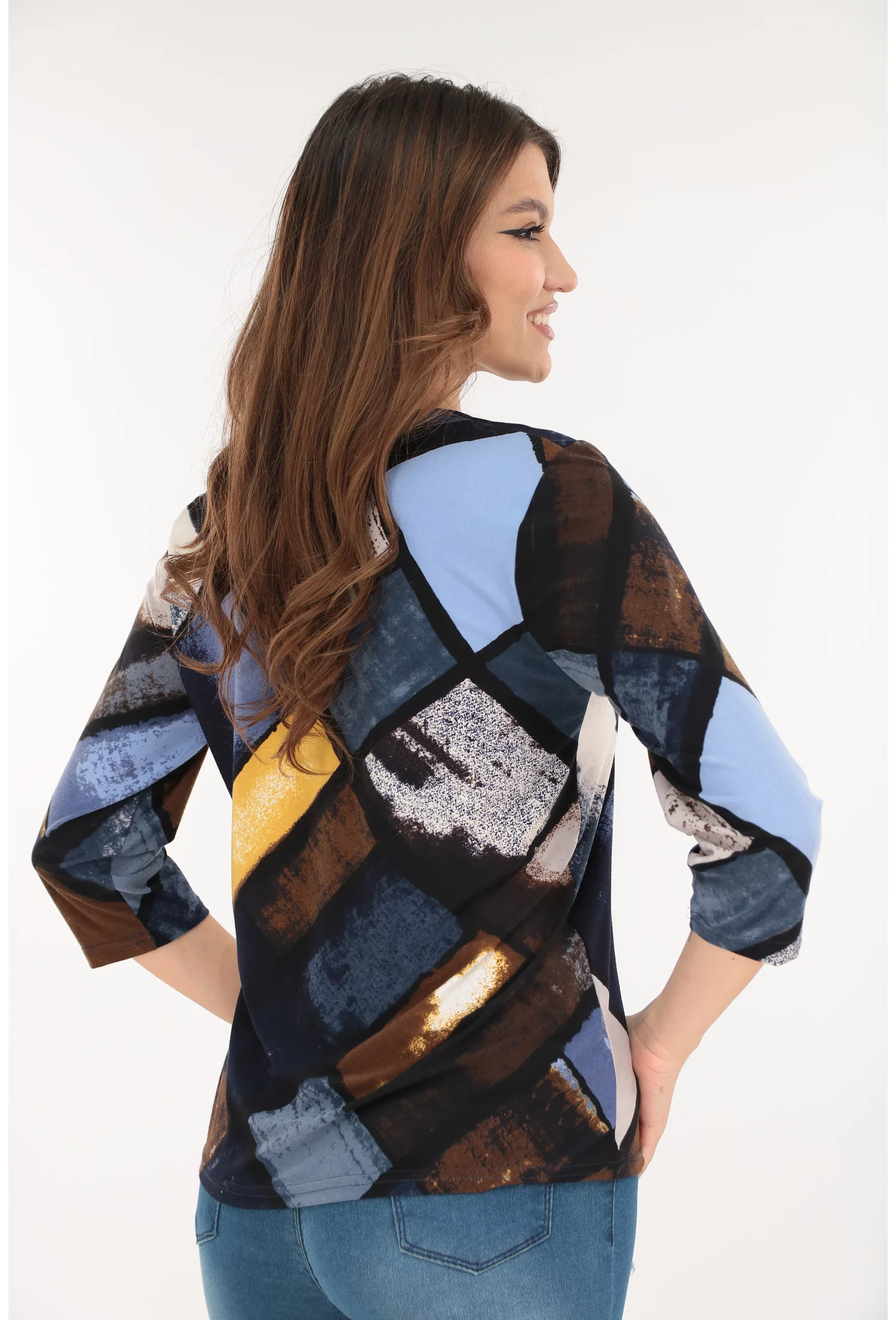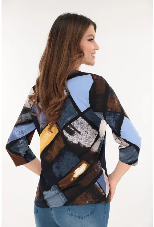 -Bluza albastra din bumbac cu print geometric galben-gri