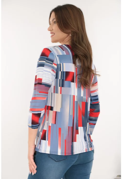 -Bluza albastra din vascoza cu imprimeu geometric rosu