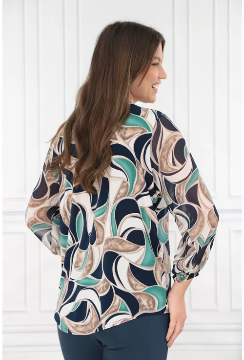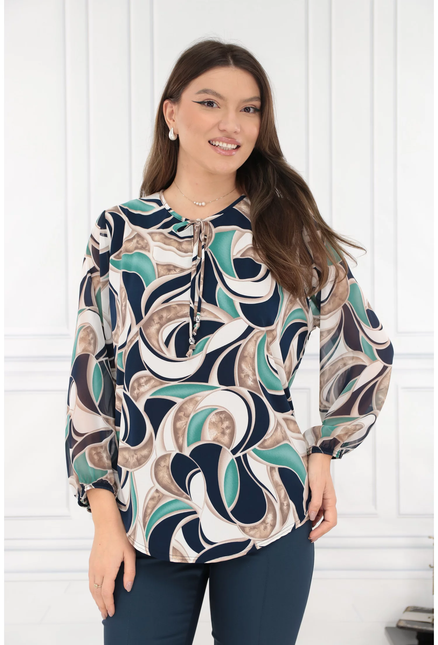 -Bluza cu print abstract vernil-bej si fundita decorativa