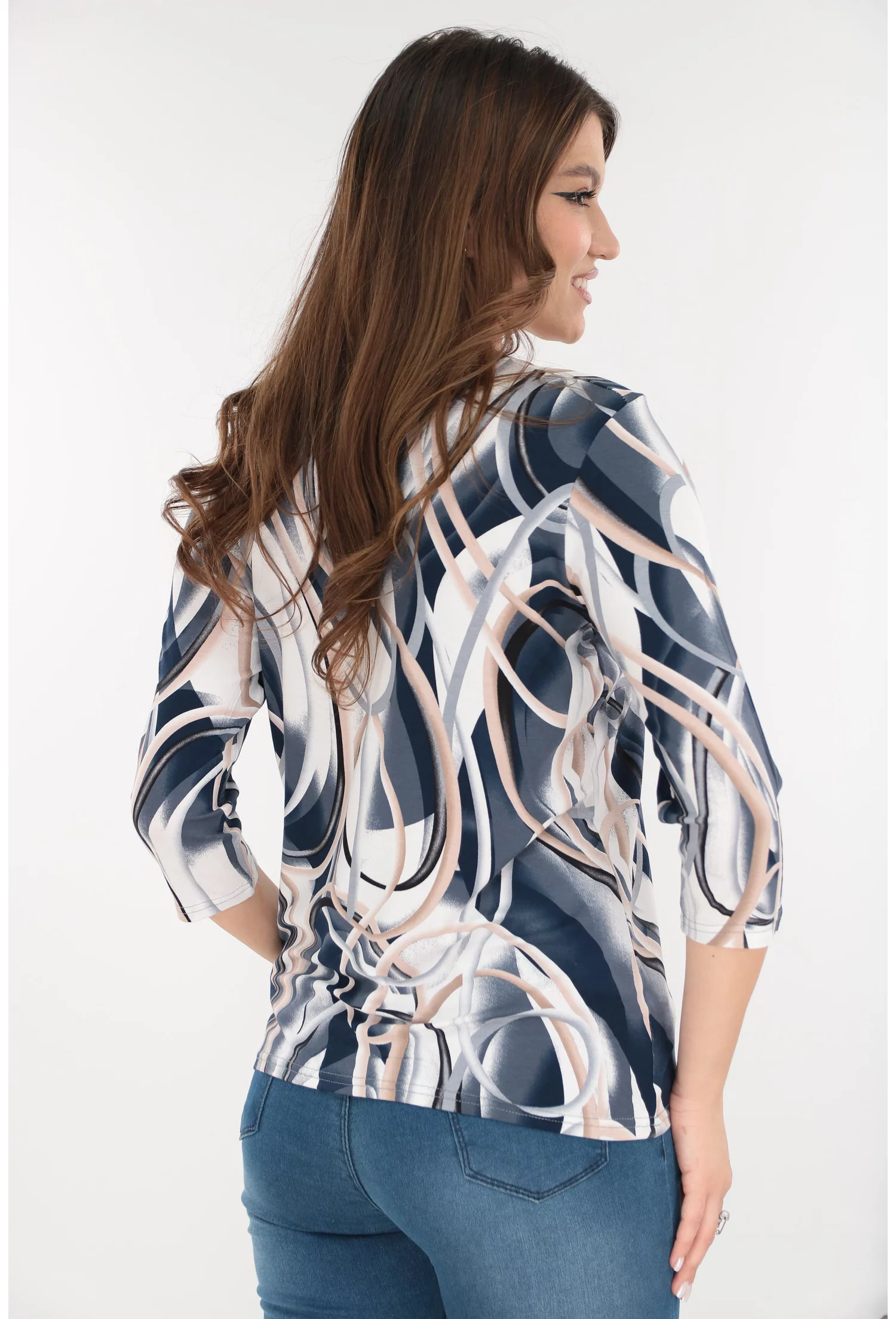 Bluza din vascoza cu imprimeu abstract bleumarin-alb