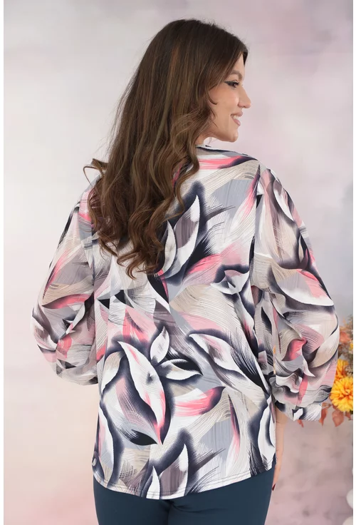 Bluza bej cu print abstract bleumarin-roz si fundita decorativa