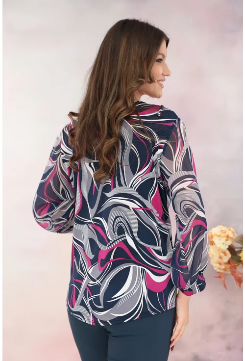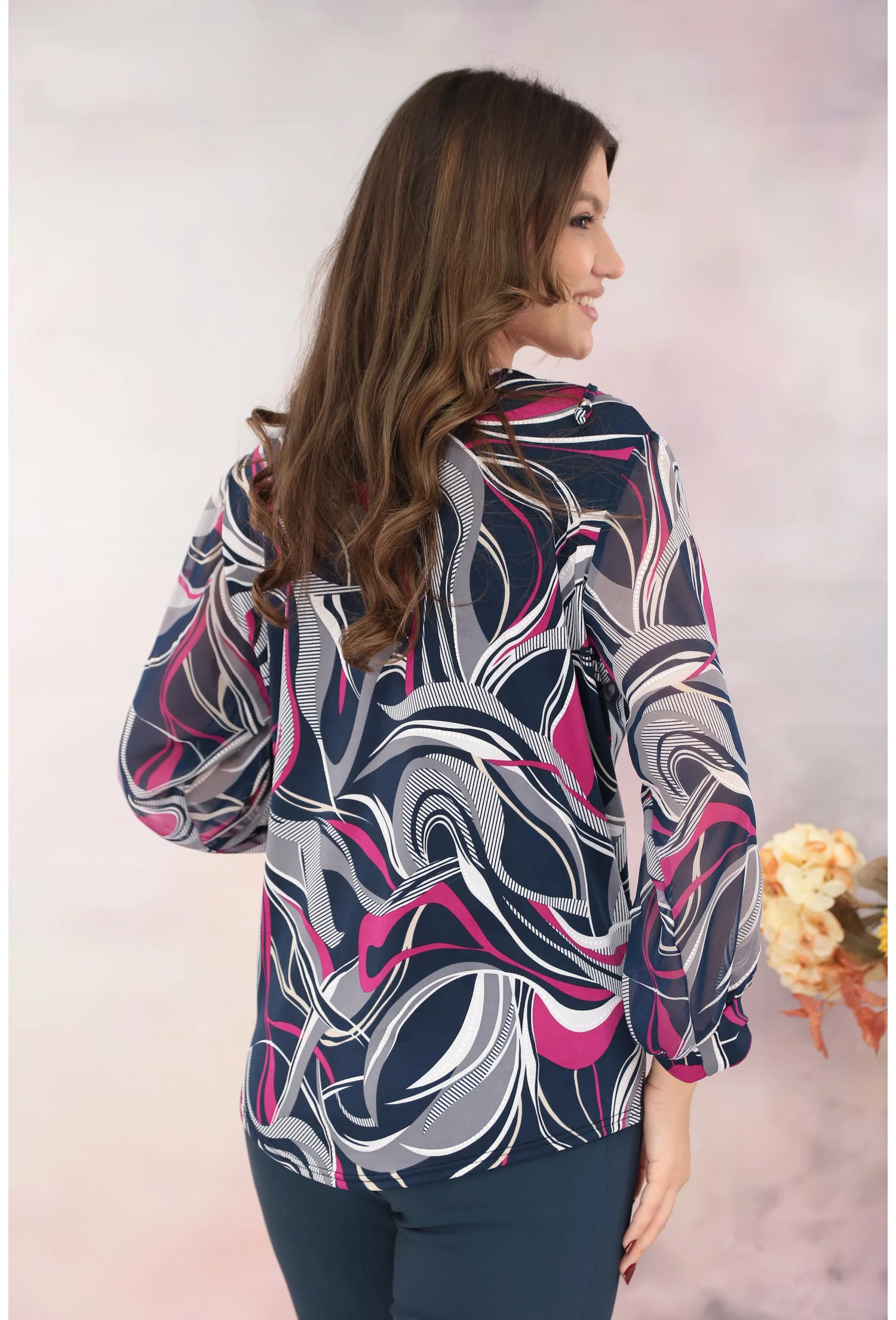 -Bluza bleumarin cu print abstract roz-alb si fundita decorativa