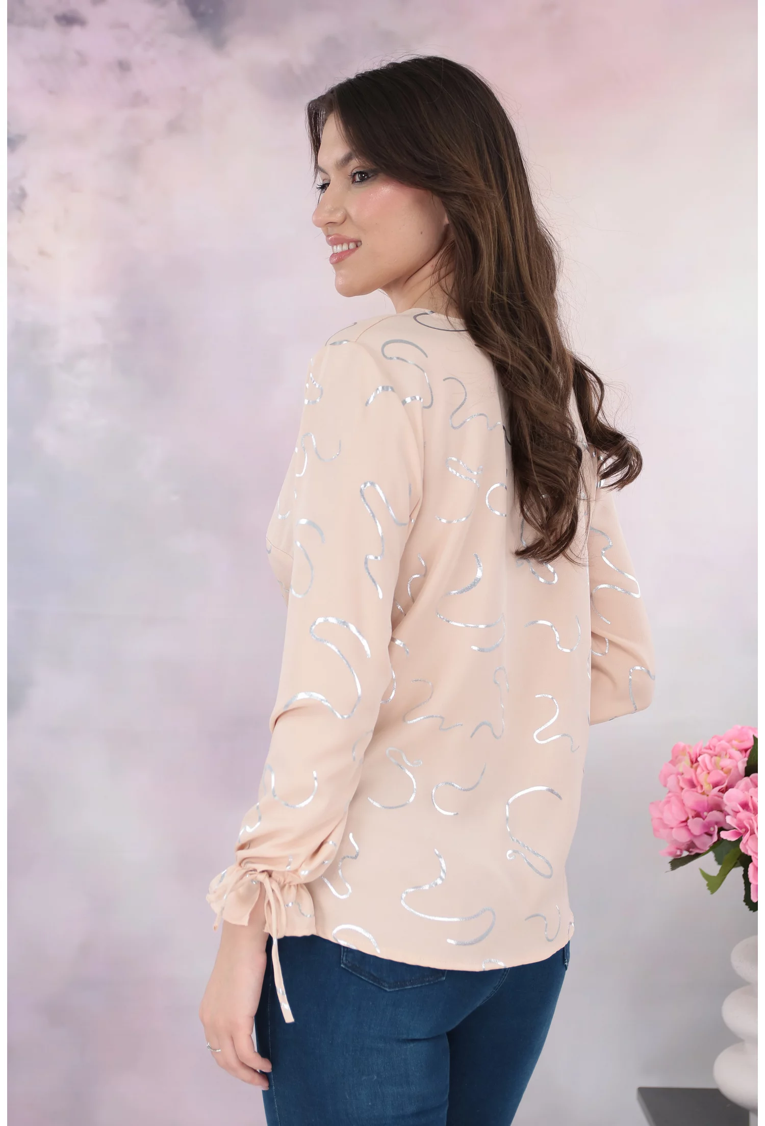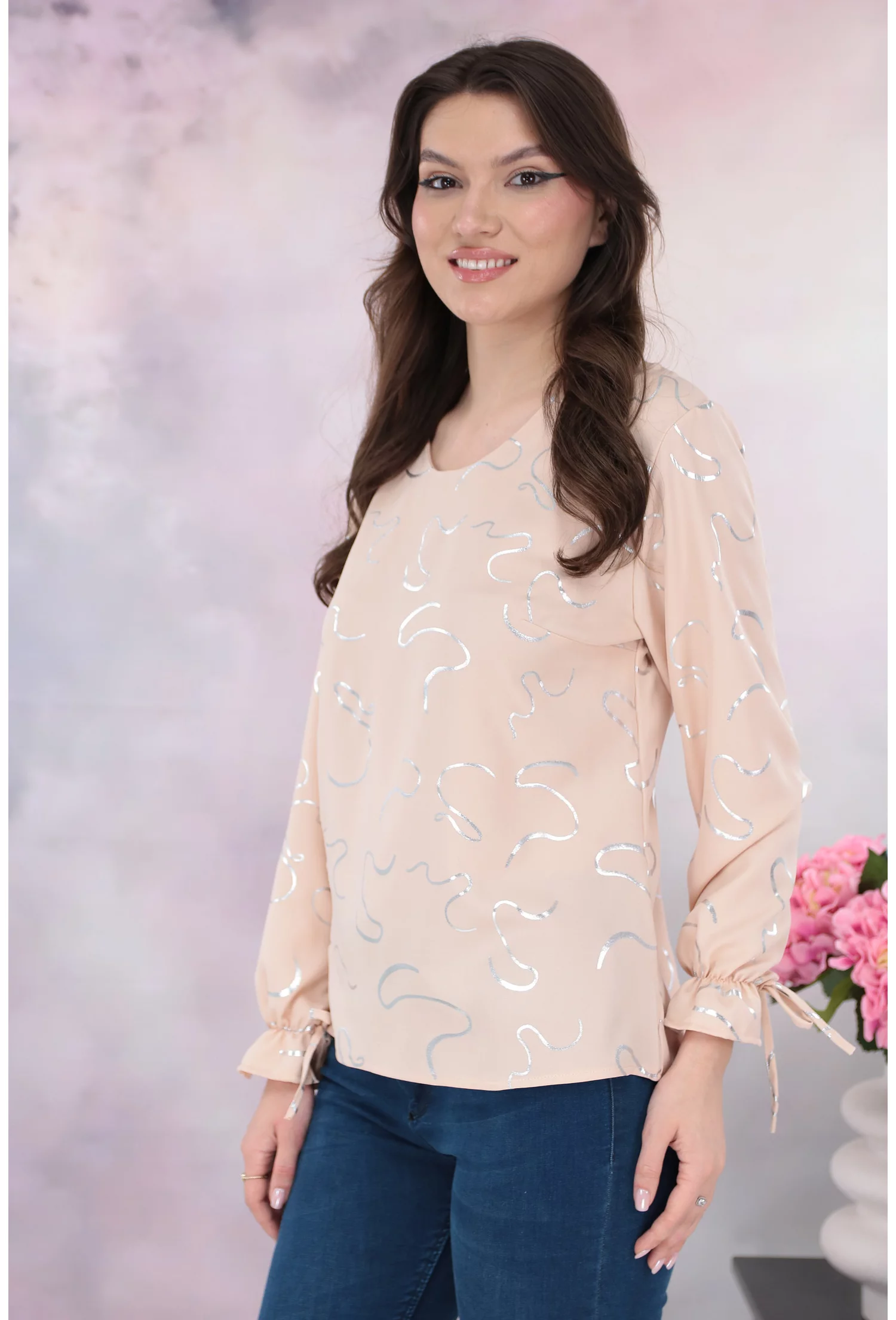 - Bluza eleganta din vascoza crem cu print abstract argintiu