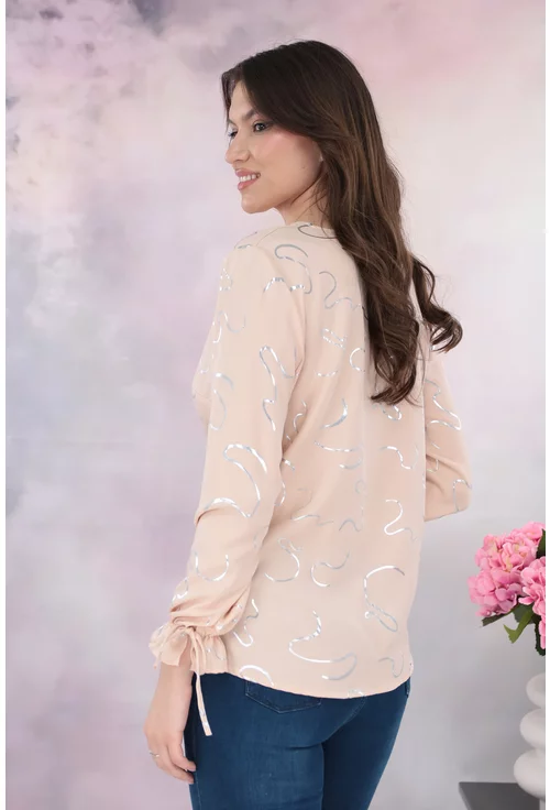 Bluza eleganta din vascoza crem cu print abstract argintiu