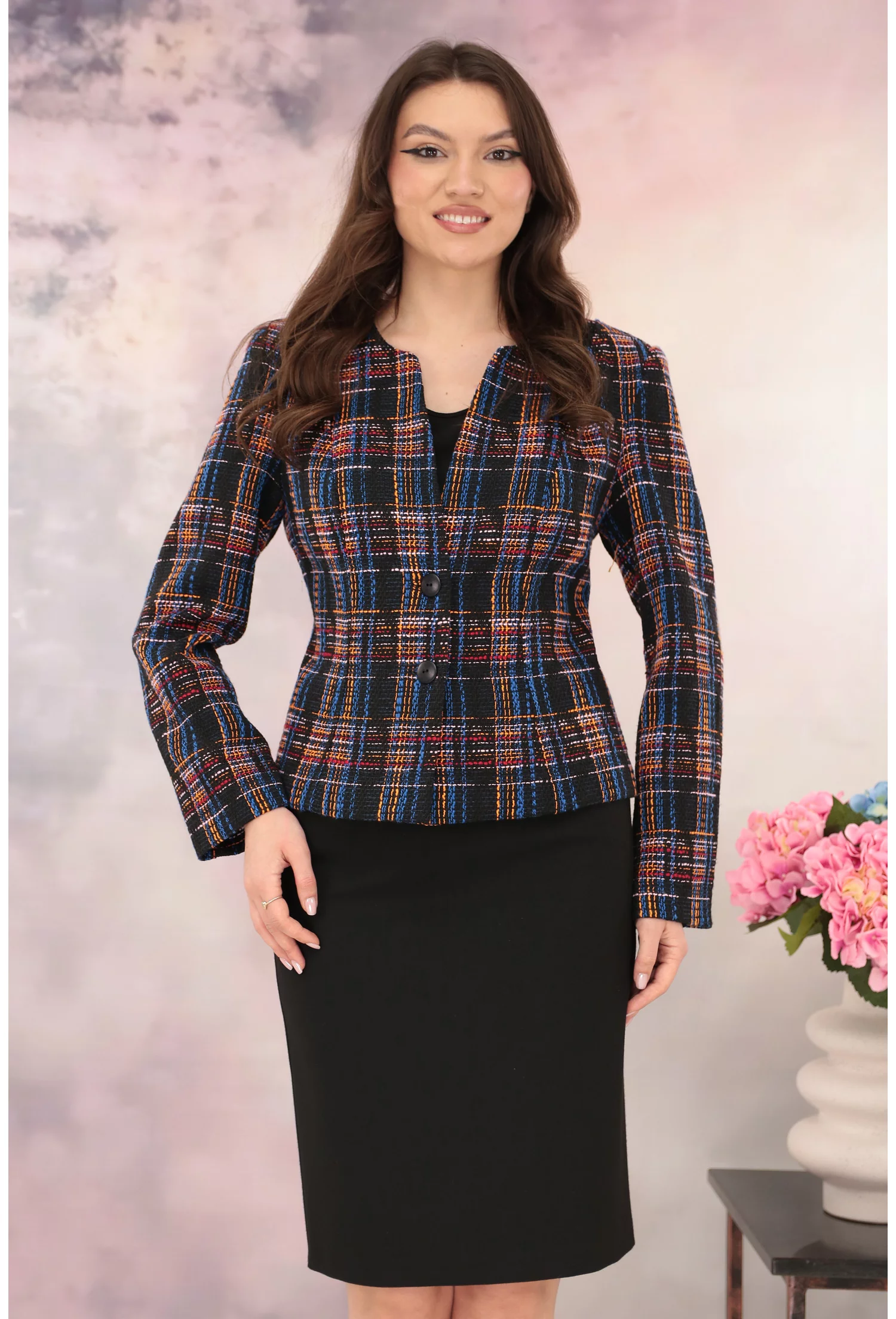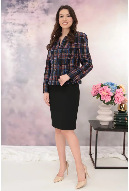 Costum - sacou cu model in carouri multicolore si fusta neagra