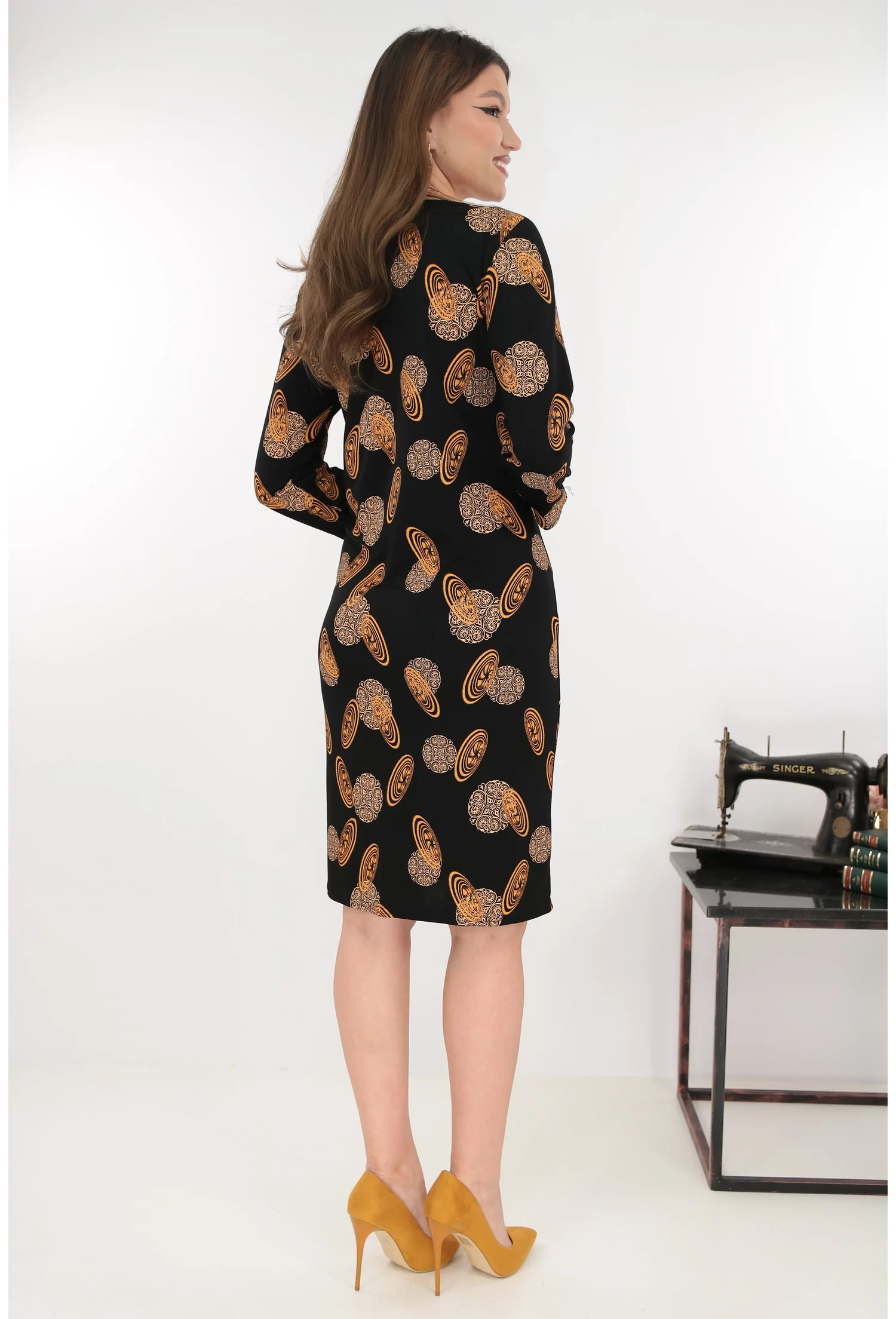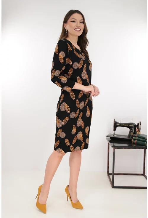 Rochie dreapta neagra cu imprimeu abstract bej