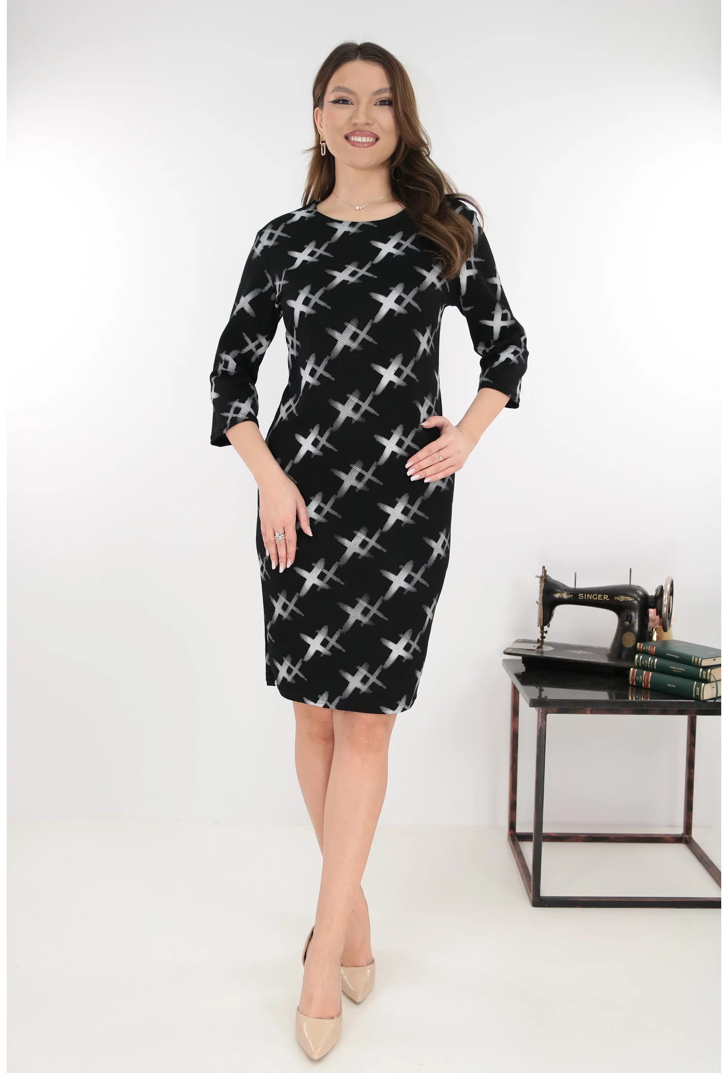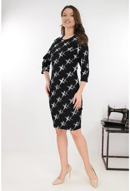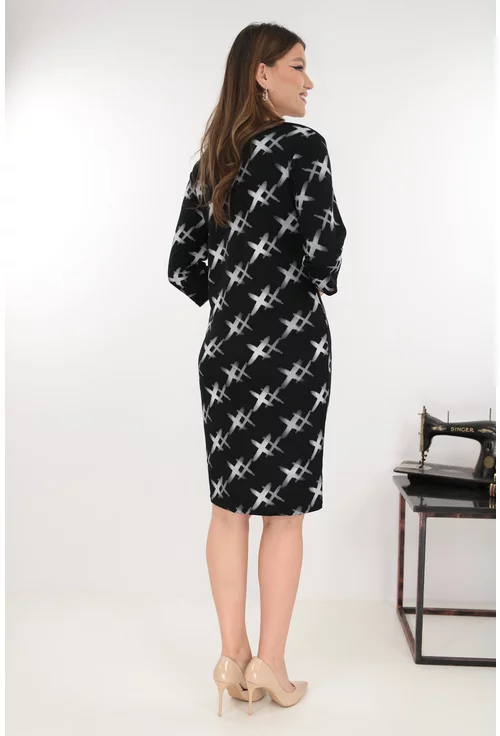 Rochie dreapta neagra cu imprimeu geometric alb