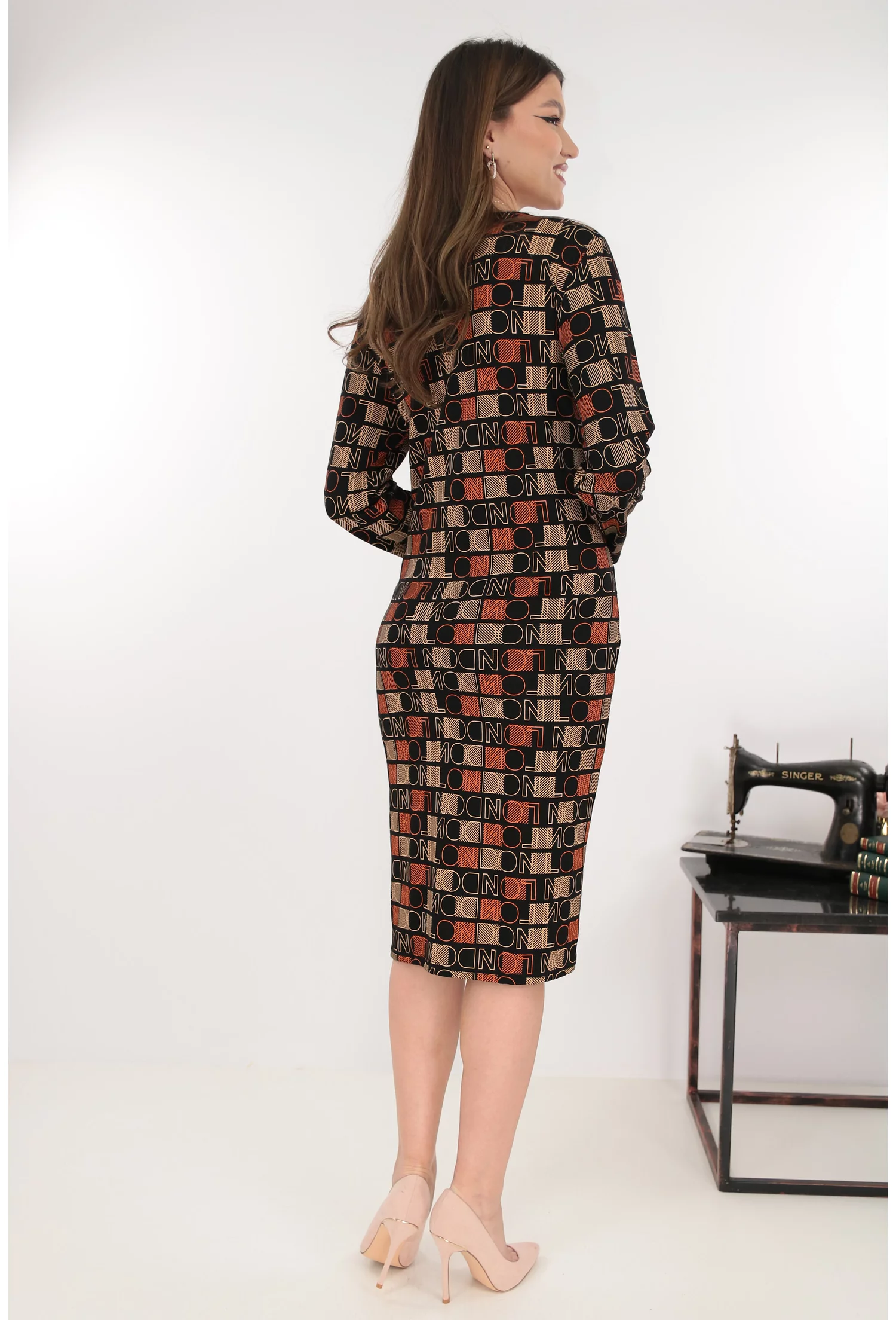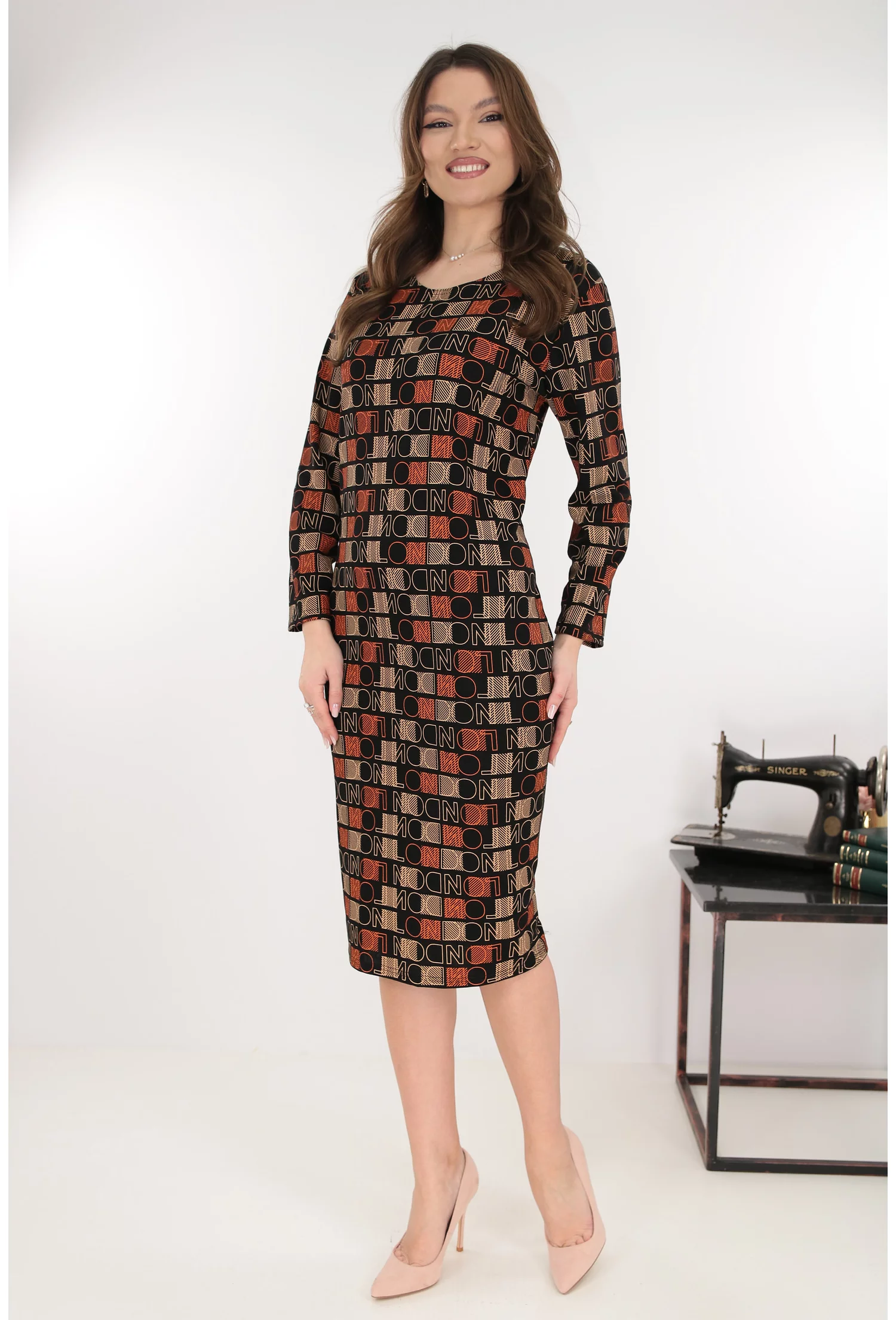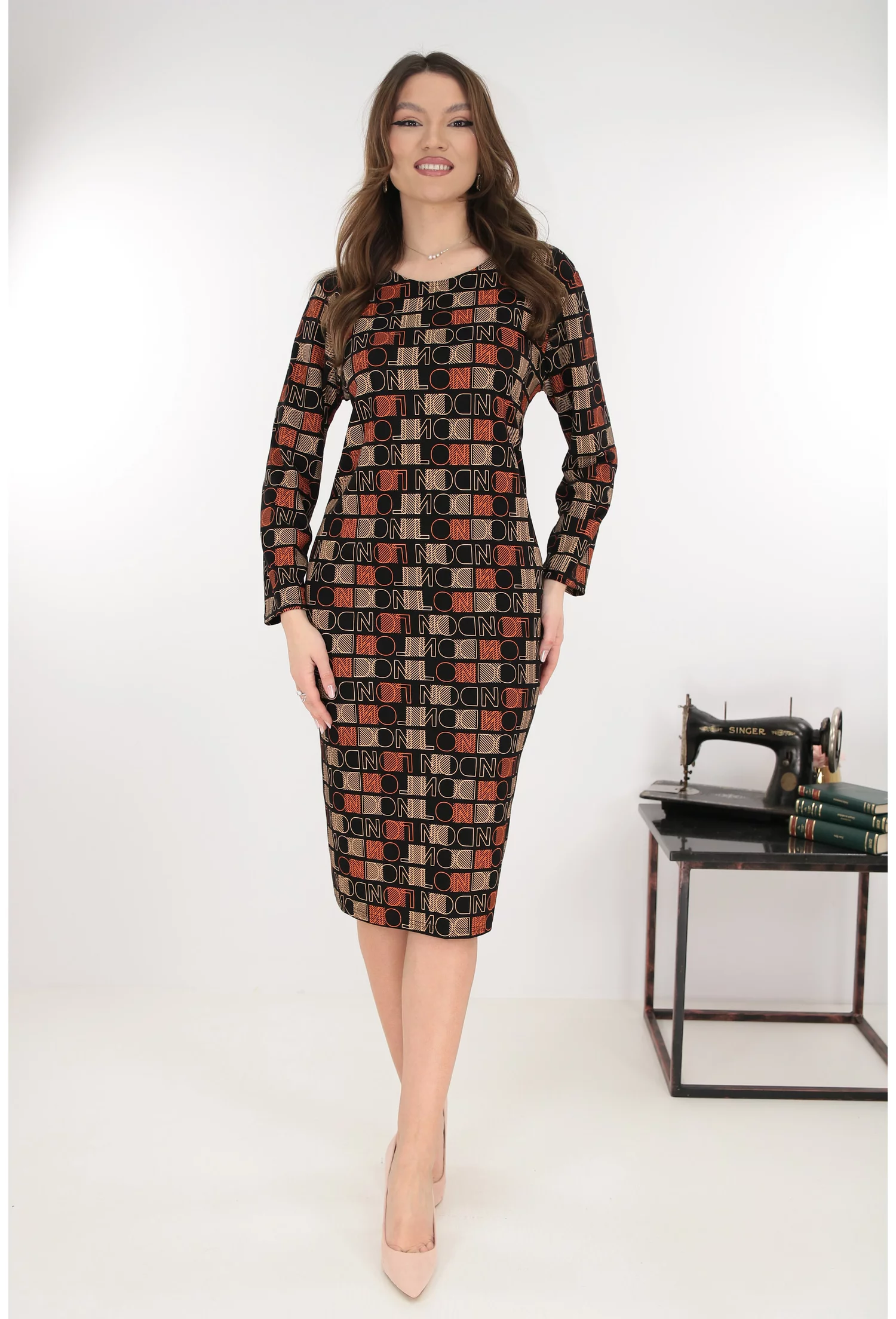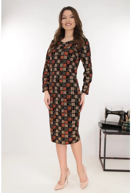 Rochie dreapta neagra cu print geometric caramiziu