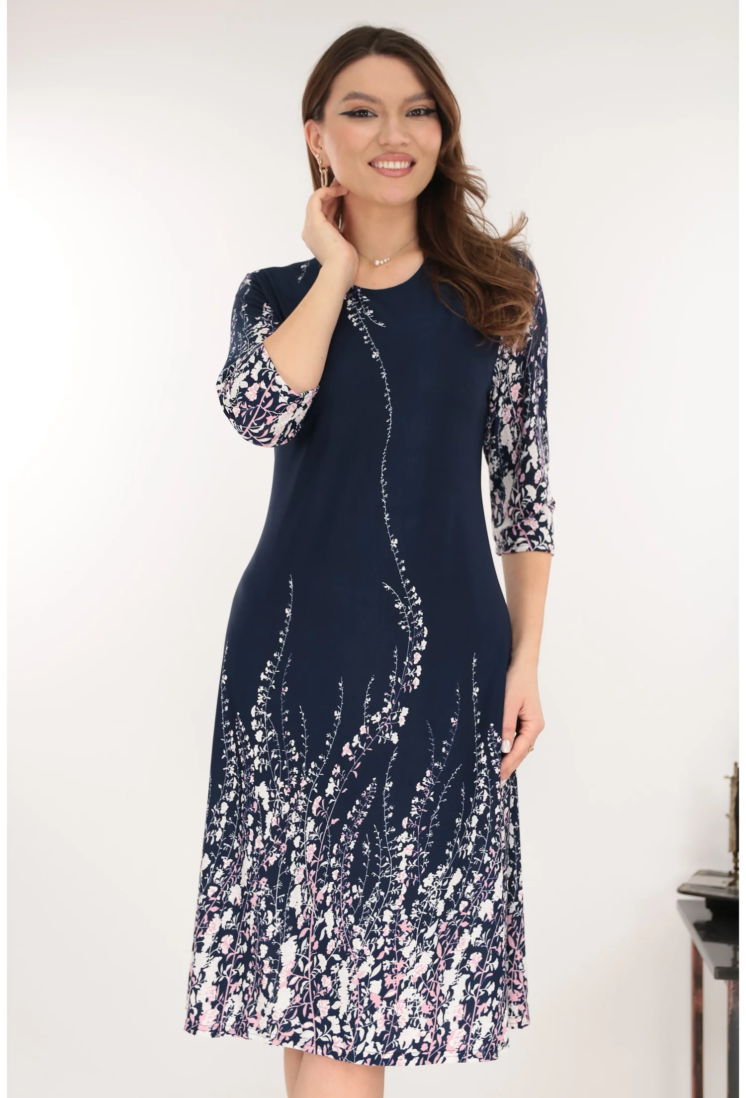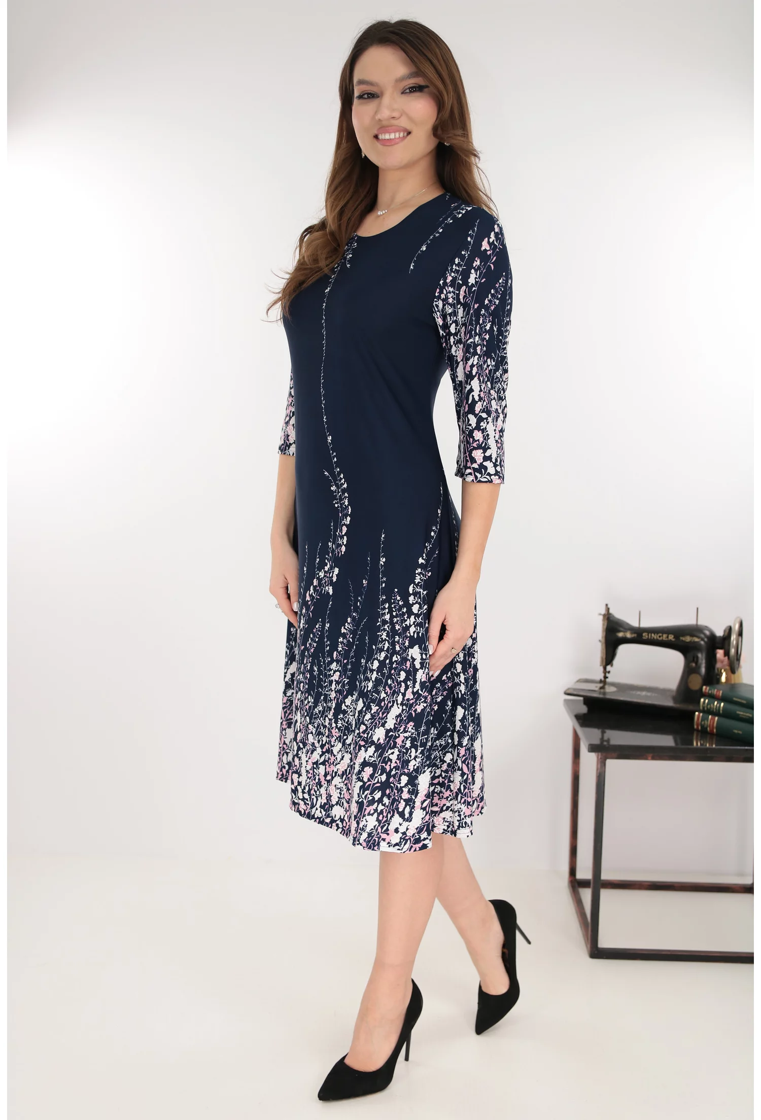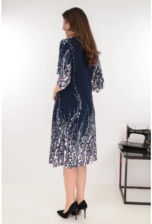 Rochie evazata bleumarin cu flori roz si albe la tiv
