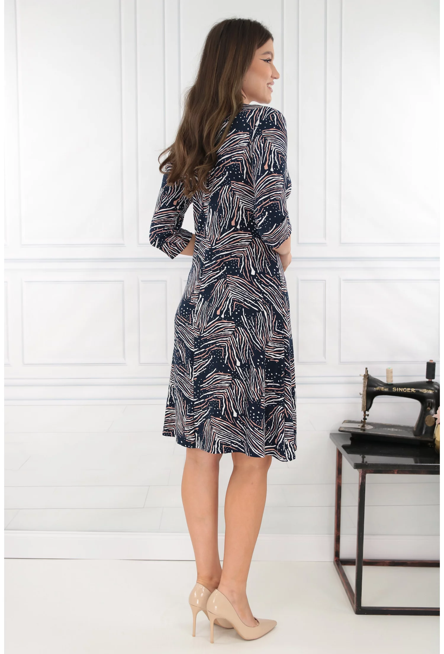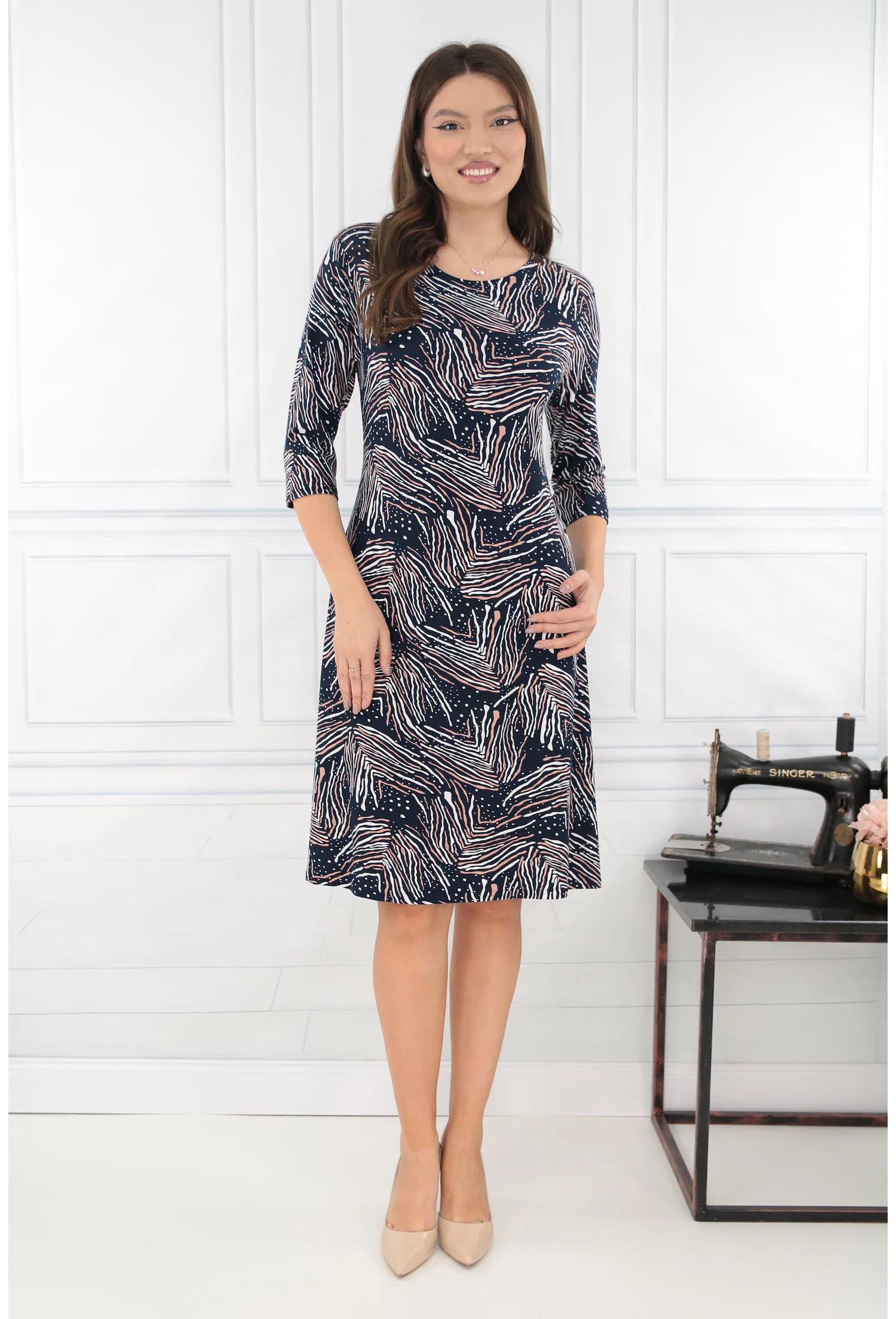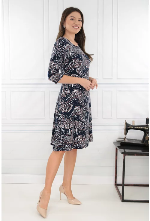 -Rochie evazata bleumarin cu print abstract alb-bej