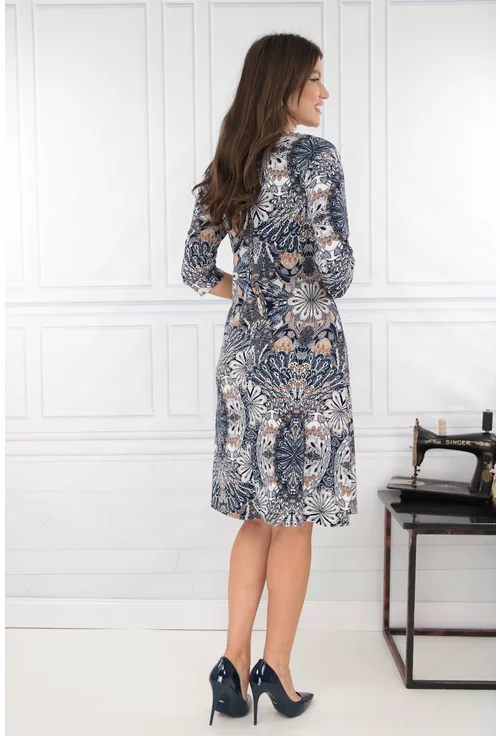 Rochie evazata cu print abstract bleumarin-bej