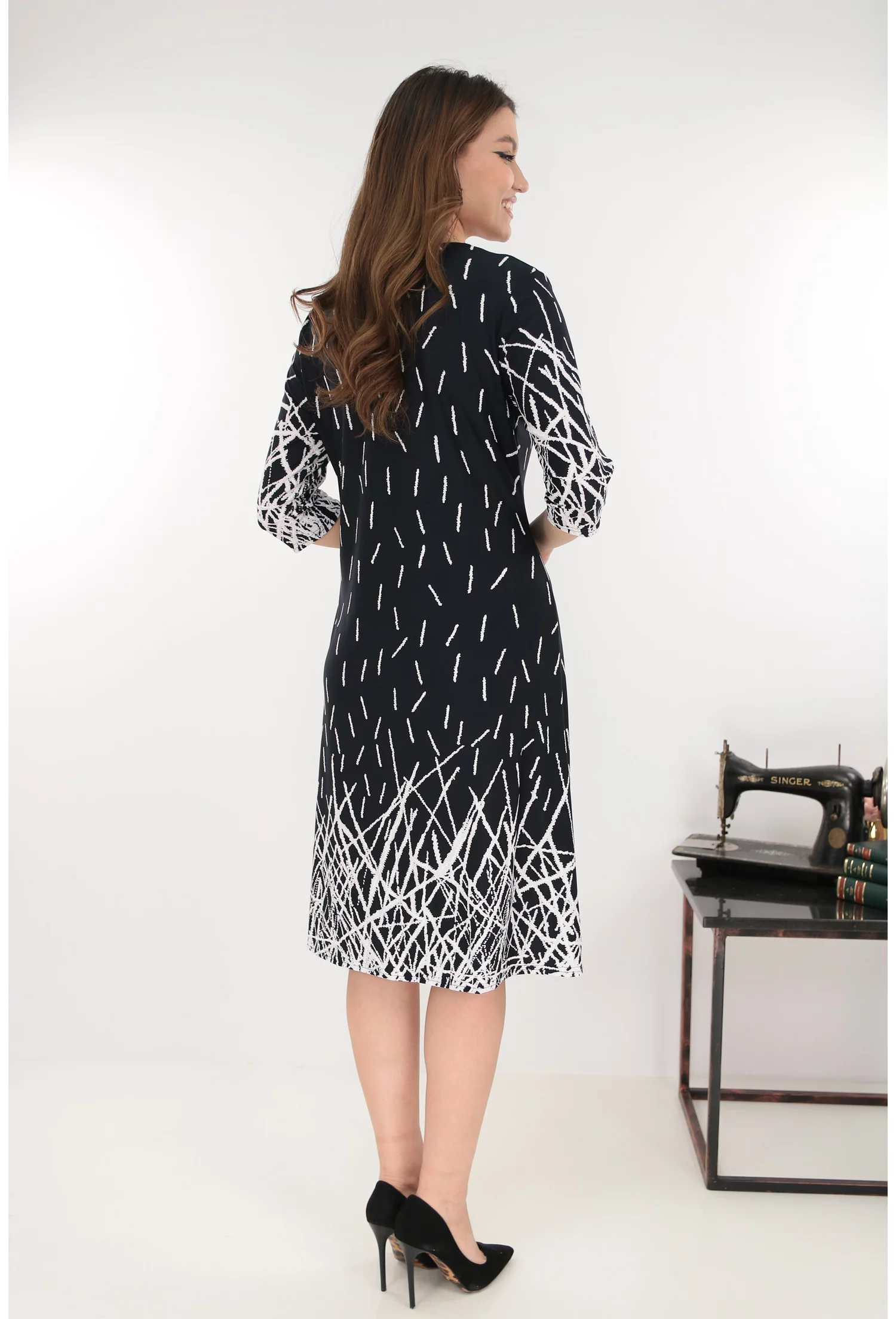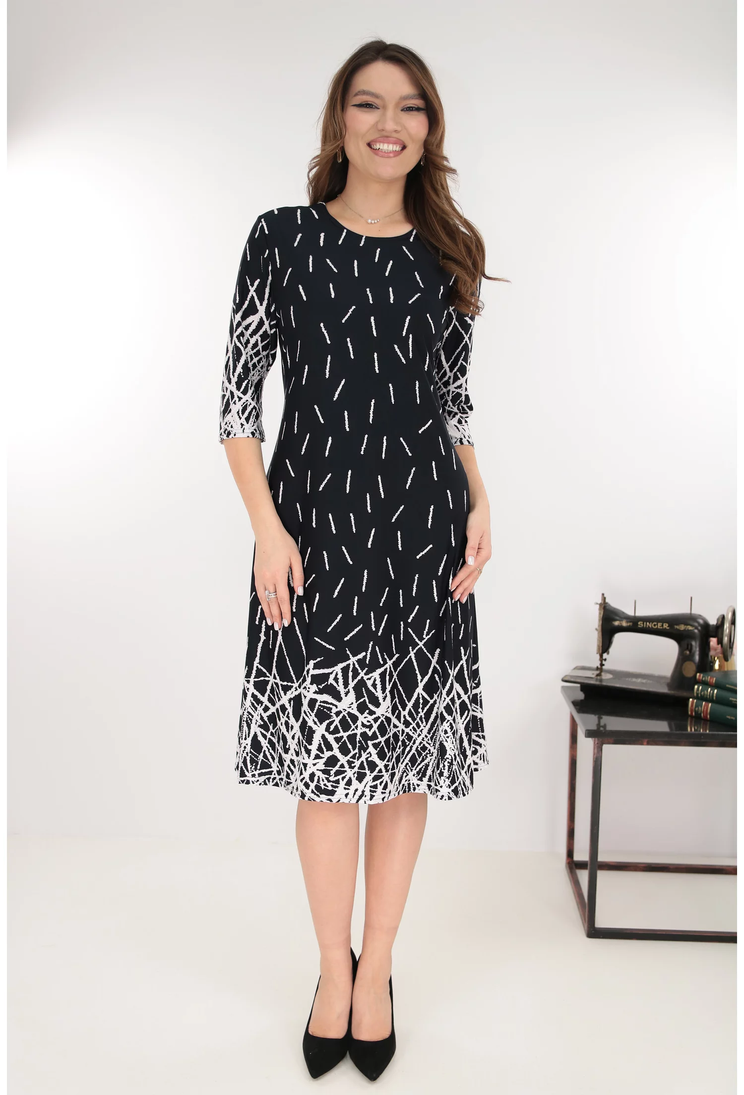 Rochie evazata neagra cu imprimeu geometric in degrade